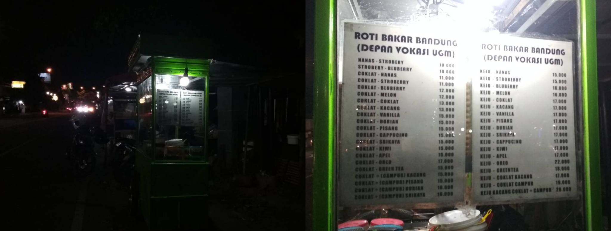 Nah, kalian masyarakat Yogyakarta yang penasaran akan kenikmatannya tidak perlu berandai-andai lagi karena Yogyakarta sudah memiliki banyak usaha roti bakar yang menggunakan gerobak sederhana maupun mendirikan toko. Para penjual roti bakar dengan gerobak mulai buka sejak sore hari sekitar pukul 16.00 hingga tengah malam atau sampai seluruh roti habis terjual di pinggir jalan. Gerobak yang digunakan seperti gerobak makanan pada umumnya yang memiliki kompor pada bagian bawah dan meja untuk melakukan persiapan masak maupun penyajian. Hal yang berbeda hanya pada wajan untuk membuat roti bakar yang datar dan cukup luas hingga mencakup setengah panjang gerobak. Setengah bagian lainnya digunakan untuk mengolesi mentega, menuangkan isi, memotong roti, dan membungkus roti dengan kertas coklat. Pada umumnya, para penjual akan memotong roti bakar menjadi lima bagian sama besar sehingga Anda akan dapat memiliki sepuluh potongan roti bakar.
